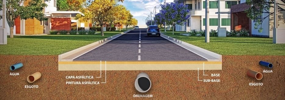 Atuação em obras de drenagem e infraestrutura urbana, através da implantação de micro e macrodrenagem, com +3 km de redes e +300.000 m² de pavimentação, incluindo guias e sarjetas.